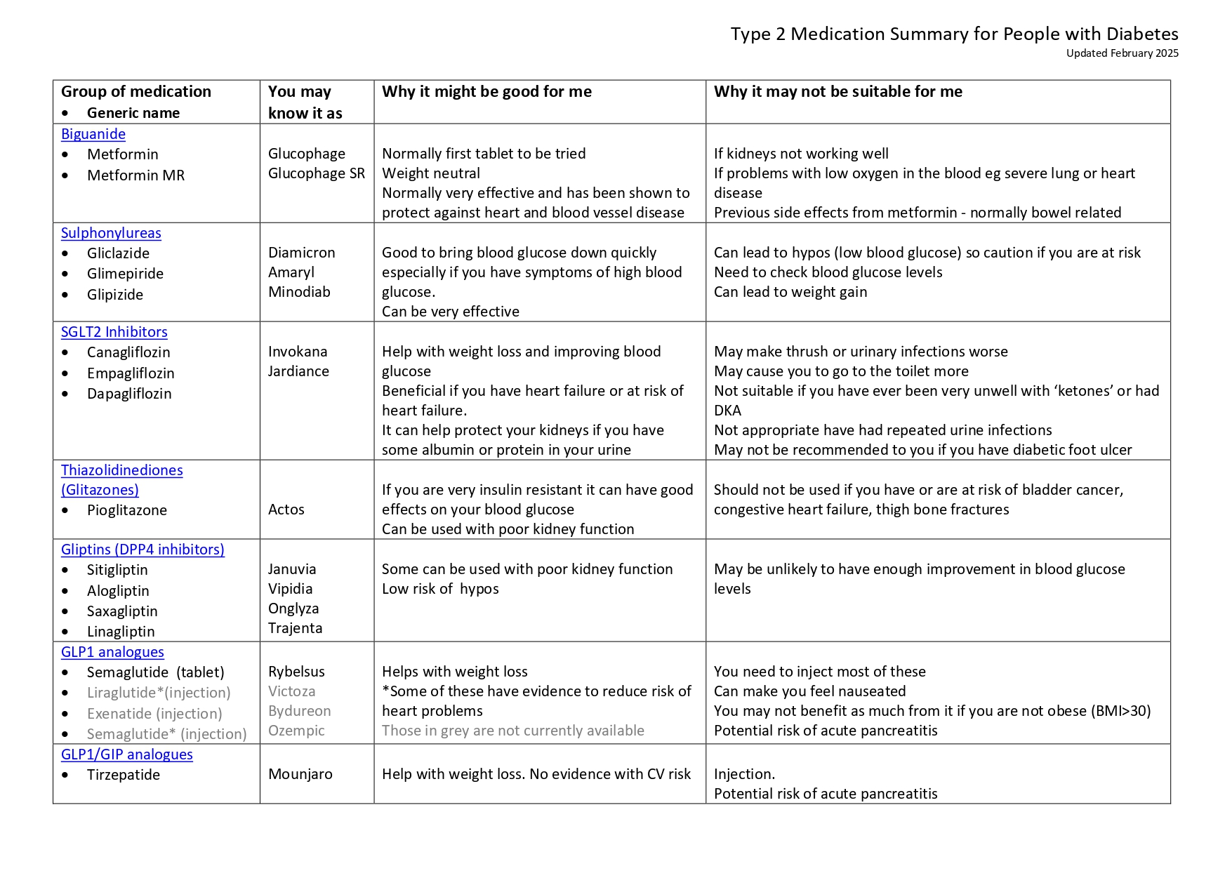 IMPORTANT: you need to discuss the best option with your diabetes health care professional and look at other available information to understand your medication choices. The table is to help summarise the different types of medications for you